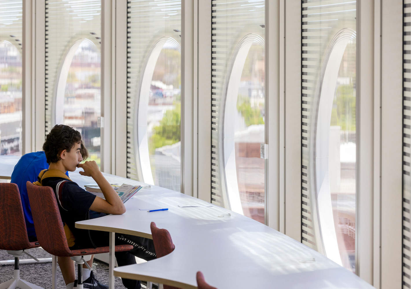 入口位于行人友好的开放空间内,远离噪音和交通。入口上方和下方的人性化楼层充满了阳光,提供了易于进入的收藏、座位和学习区。对于社区中的许多人来说,这是一个积极的未来,因此受到高度重视,年轻人被提升到大楼的顶端,一个高质量和安全的地方,在那里,青年和儿童可以拥有自己的领域。青年区支持小组学习和社会化。非常受欢迎的“城堡之王”树屋休息室庆祝儿童水平的美好前景。
