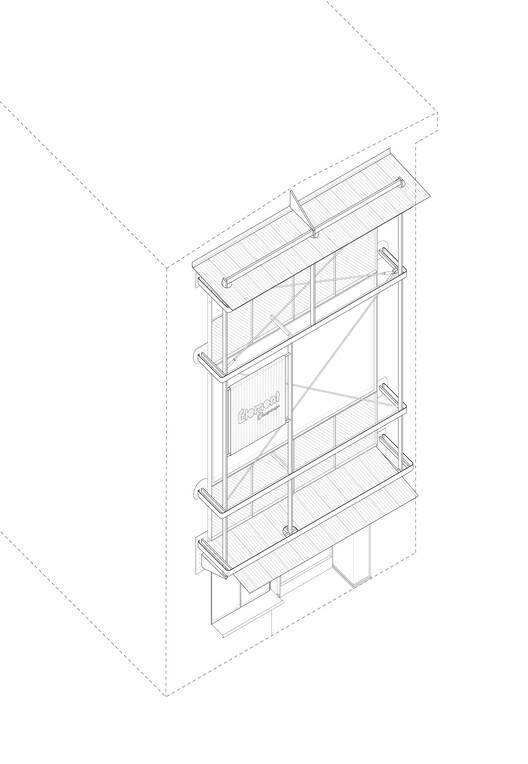 捕捉城市间隙的生活。建筑物周围,房屋和商店交织在一起;杂乱的衣架、空调和遮阳篷像建筑寄生虫一样突出,是上海独特街景的缩影。立面干预是对这种城市拼贴的回应。一个钢制外骨骼从一楼爬到三楼,集成了门、窗和标志架,可以获得最大的日光和视野。它支撑着遮阳篷和咖啡馆柜台,同时作为季节性横幅的脚手架——这是对相邻洗衣杆的现代致敬,形成了一个可识别的立面特征,与住宅建筑融为一体,相互反映。