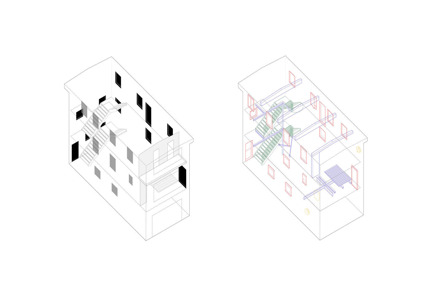The approach was to confront the banality of the building, observe and extract its common architectural elements. Previous modifications - steel beams, emergency exit doors, air conditioning units, and fire hydrants are highlighted through chromatic coding. Sealed windows are reopened and clad with operable metal shutters, reasserting the building's character while revealing its traces of time. The original rusty steel staircase is preserved and revealed, painted forest green, and refined with new railings. The original elements of the building are marked and emphasized.