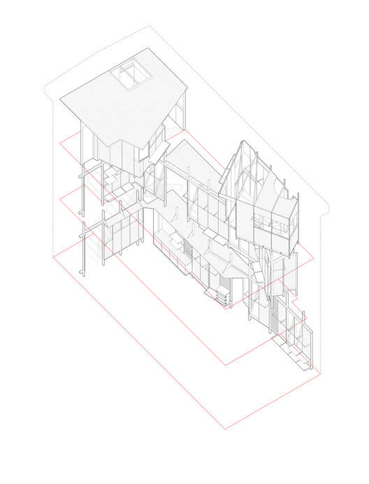内部空间与使用者体验:在内部空间的设计上,项目同样展现了精湛的设计技巧。通过木框架的巧妙运用,设计师在单调的矩形空间中创造了丰富的层次感和动感。框架不仅定义了不同的功能区域,还营造了一种“不稳定”的视觉效果,增加了空间的趣味性。垂直循环的设计也值得称赞,绿色的楼梯穿梭于悬挑的平台之间,构成了一个动态的旅程,提升了使用者体验。 此外,咖啡馆柜台的设置,将内部空间向外延伸,创造了户外座位区,进一步加强了建筑与社区之间的互动。 这充分体现了设计师对使用者体验的关注和对空间价值的深度挖掘。