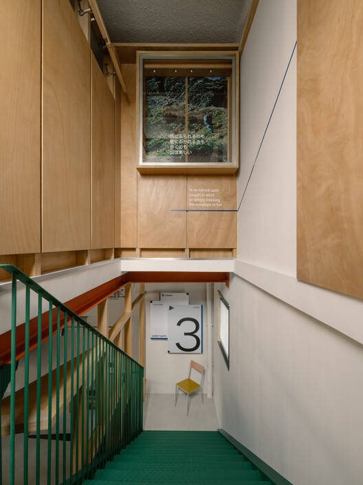 垂直循环变成了一个动态的旅程:绿色的楼梯穿过悬挑的平台,构成了楼层间零散的景观。木制框架充当了可渗透的屏幕,展示了建筑元素与多种材料和颜色标记相结合的分层场景,行走充满了活力。