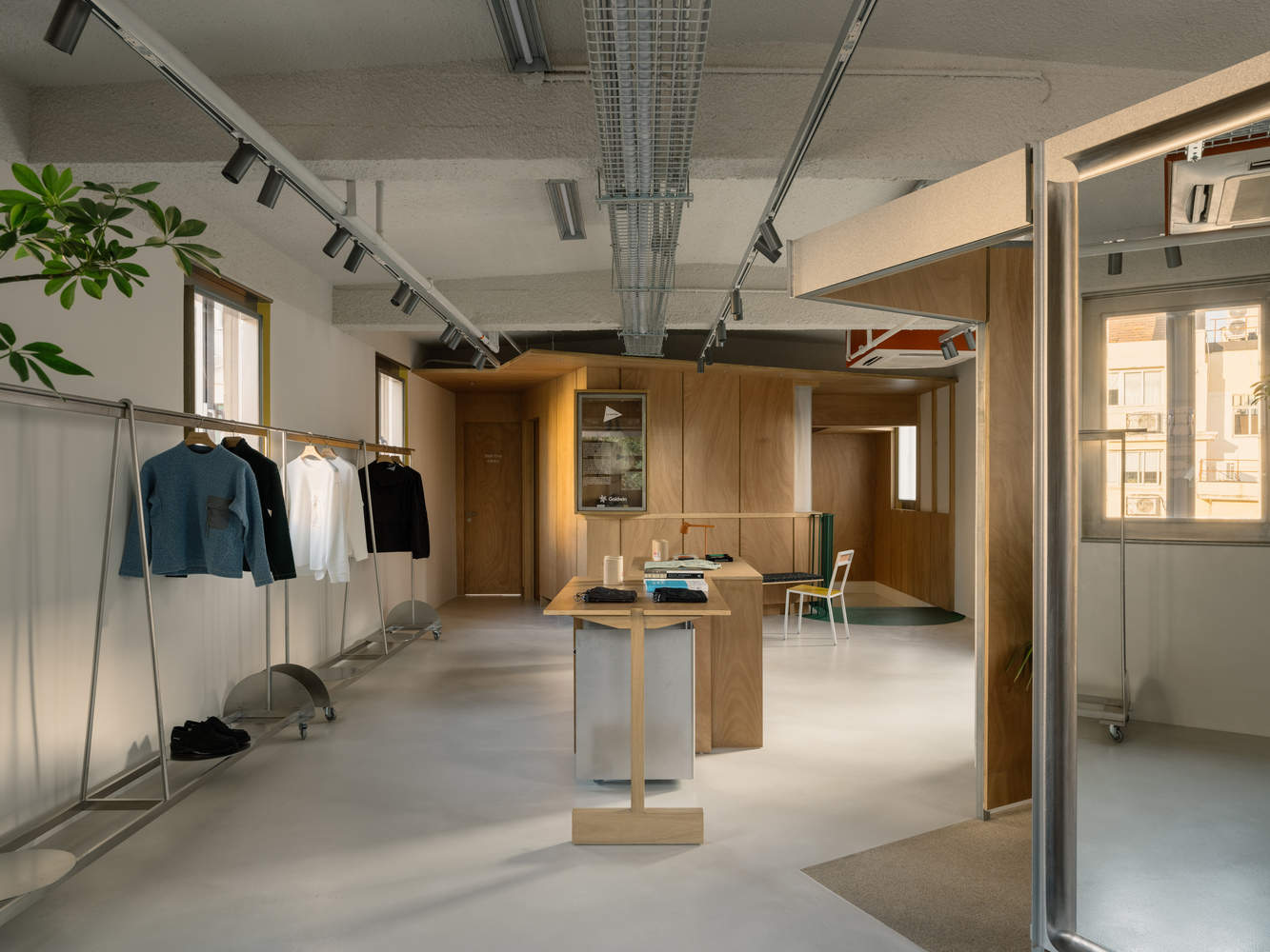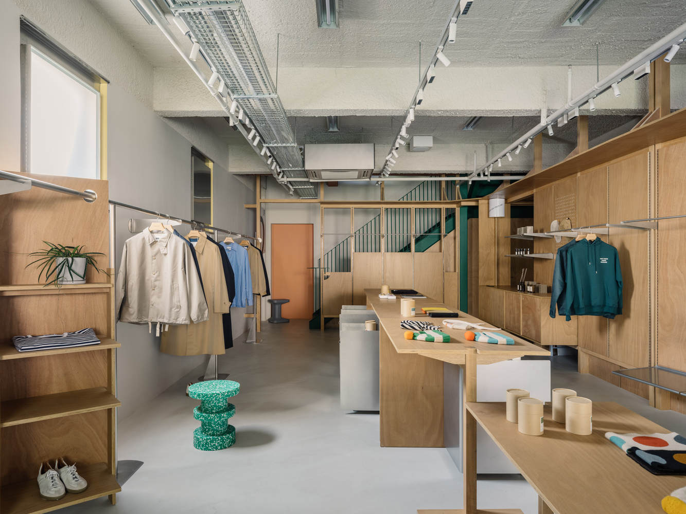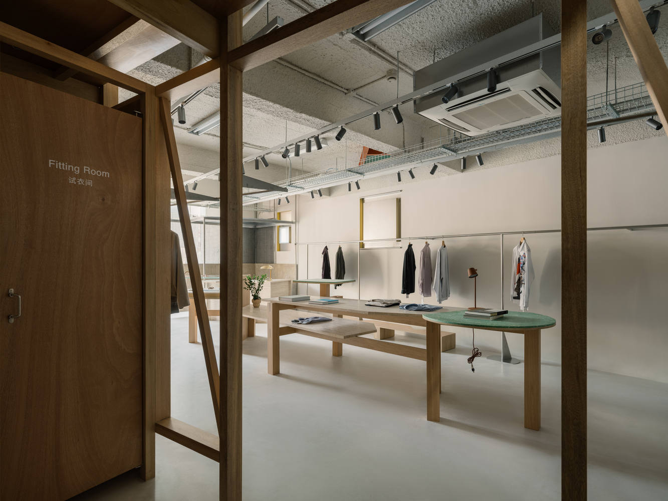 The messy vitality and order. Within each floor's rigid shell, precisely controlled diagonal interventions formed with solid wood frames or metal sheds, break the monotony of the single form and strengthen the sense of instability of the space. The timber framework bypasses the green staircase, and concealing functional spaces - the changing room and storage room and cashier behind angular folds, while the front side presenting modular display systems. This system of adaptable racks and panels contrasts with the slender stainless steel clothes rods on the opposite wall.