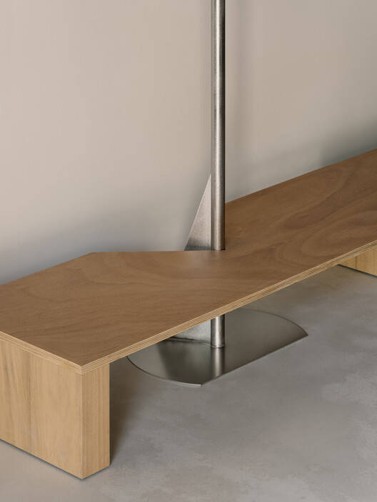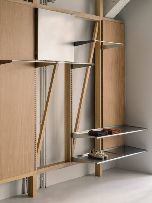 凌乱的生命力和秩序。在每层楼的刚性外壳内,由实木框架或金属棚形成的精确控制的对角线干预,打破了单一形式的单调,增强了空间的不稳定性。木框架绕过绿色楼梯,隐藏了功能空间——更衣室、储藏室和收银台,隐藏在棱角分明的褶皱后面,而正面则展示了模块化的展示系统。这种可适应的架子和面板系统与对面墙上细长的不锈钢晾衣杆形成鲜明对比。