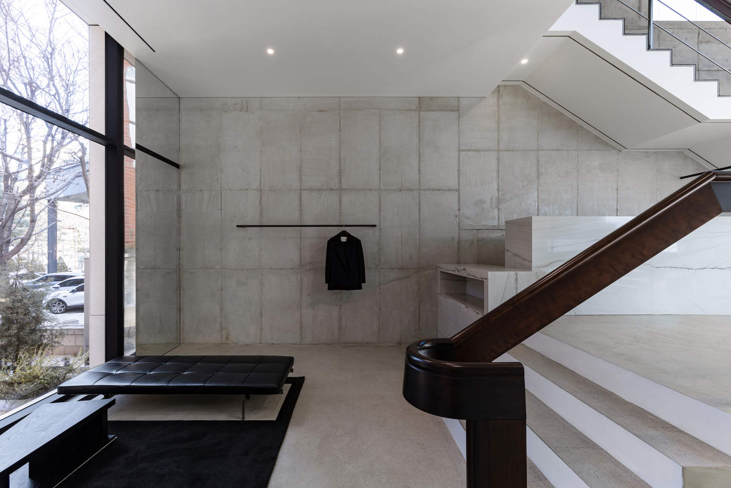 The handrail acts as a continuous line that organically connects the entire space. This design language is closely aligned with the single-line hanging rack system introduced in the previous showroom. Designed as both an architectural and furniture-like element, the handrail naturally guides circulation while also serving multiple spatial functions—such as a bench, clothing rack, and mirror. Crafted in segmented units and assembled on-site, its furniture-like characteristics are further emphasized.