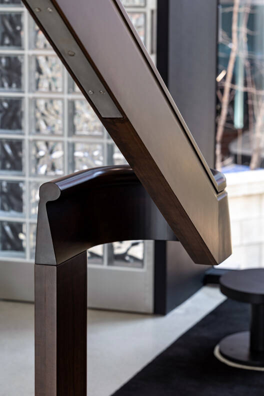 The handrail's grip is custom-made from solid cherry wood, maintains a solid, weighty feel while maximizing its volume within a single piece of timber, adding warmth and comfort to the space.