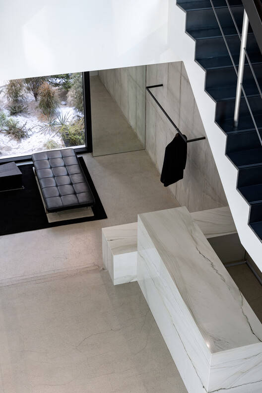 每一层都旨在突出不同的材料特性,同时为参观者提供暂停、休息和欣赏展厅的空间。1.5楼享有花园的景致,采用黑色家具和玻璃块设计,营造出现代氛围。在下一层,有一个整体大理石柜台。在三楼,一个用热轧钢制成的试衣间拥抱着这种材料的原始质感。窗户旁的浮动钢架和架子增加了空间的深度,同时巧妙地控制了自然光。