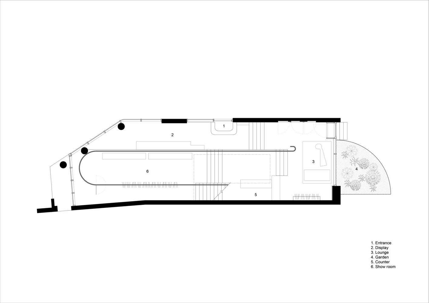 The showroom is composed of five levels organized around a central void. To maximize its vertical layout, the space is designed with a key architectural element: the handrail, which serves as a spatial marker while guiding visitors through the showroom.
