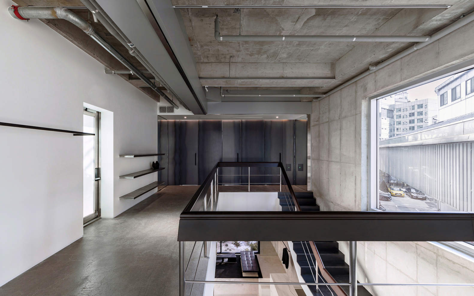 Each level is designed to highlight different material characteristics while also offering visitors spaces to pause, rest, and appreciate the showroom. The 1.5th floor, with views of the garden, is designed with black-toned furniture and glass blocks, creating a modern atmosphere. On the next level, there is a monolithic marble counter. On the third floor, a fitting room finished in hot-rolled steel embraces the raw texture of the material. Floating steel racks and shelves by the window add depth to the space, while subtly controlling the natural light.