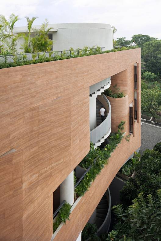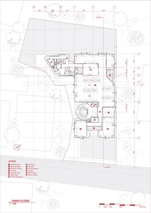 从用户功能的角度来看,混合用途设计在深处隐藏了一个高安全性的文件室,周围是灵活的开放式工作空间,两侧是一系列小型到大型的会议室,中间有一个门厅口袋花园和休闲空间。这种布局促进了每层楼的短连接,方便了从传统办公桌到建筑内的会议室、休息室和休闲空间的移动,所有这些都设计有民主的通道和不同楼层的微妙变化。所有楼层的一个一致特征是,服务和卫生间位于单独的翼楼,设计为花园厕所,以确保在热带环境中获得最佳舒适度,同时最大限度地减少能耗。
