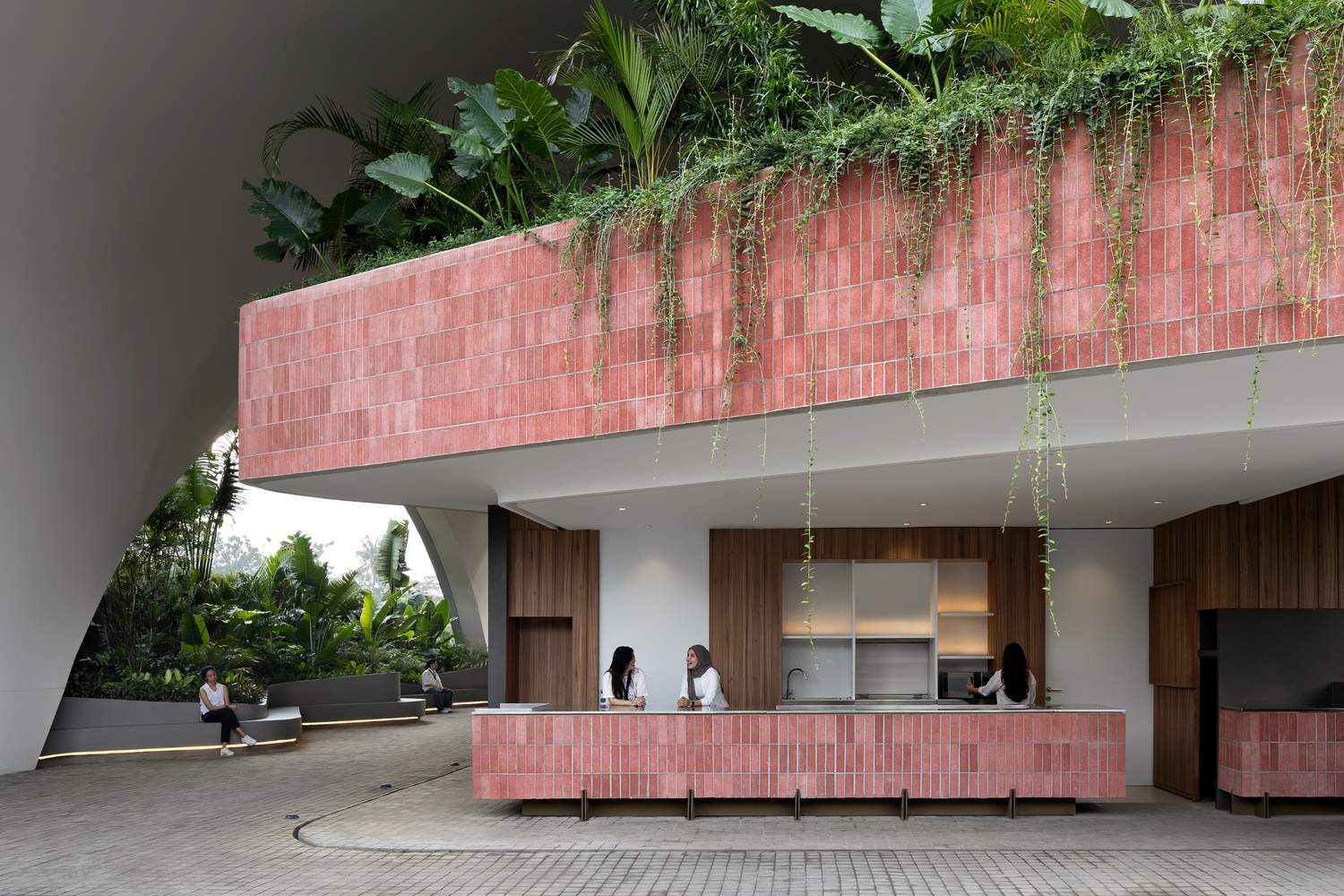 Sagehaus Office is a "Dome for Wind," a reversed carved space designed to channel and intensify Jakarta's gentle breezes through shaded, sheltered gathering and social spaces, creating a pleasant and safe environment for all staff activities. The enclosed breezeways between the blocks are designed for maximum comfort and interaction, offering spaces for groups of various sizes to engage and relax. This wind-directing design has proven to be both successful and extremely comfortable, providing constant cooling breezes despite Jakarta's high humidity. Meanwhile, the rooftop is designed as a large recreational green roof and office gym.