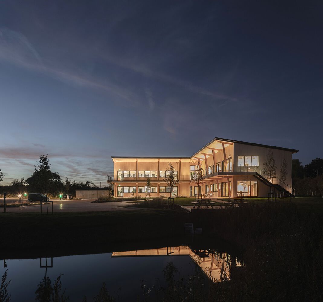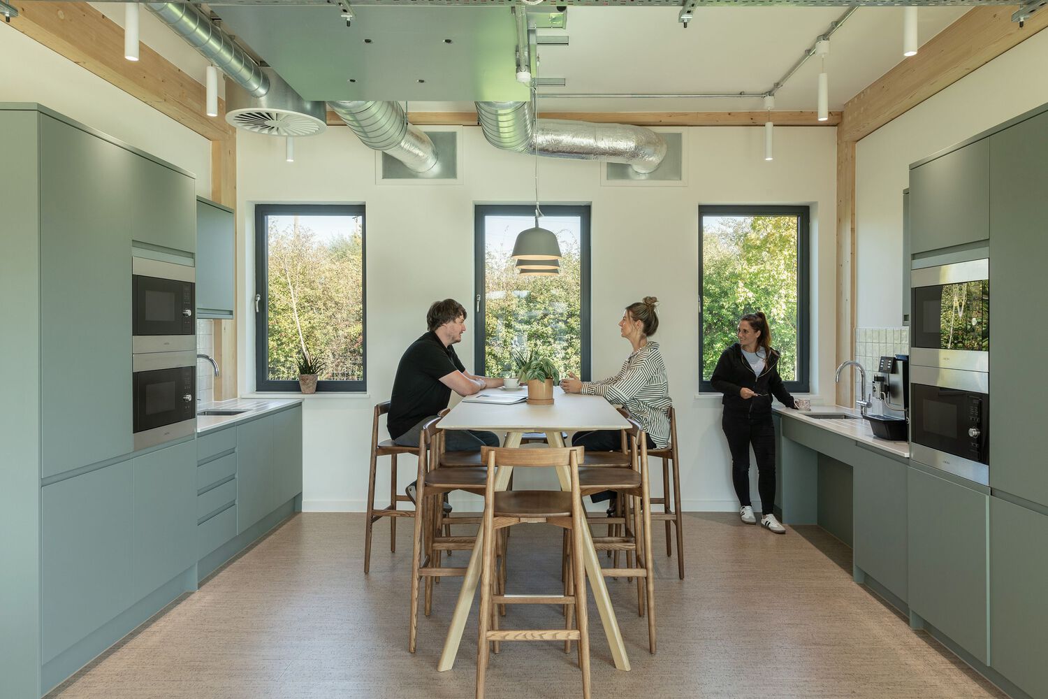 Internally, the layout offers a blend of open-plan offices, private meeting rooms, breakout areas, and a canteen, balancing collaboration and privacy while allowing for flexibility as the company evolves. The design follows a fabric-first approach based on Passive House standards to ensure high levels of energy efficiency, whilst also minimising embodied carbon throughout. Biophilic design principles, such as natural planting and organic forms, are seamlessly integrated, promoting a healthier and more productive workplace. Circular economy principles guided the interior fit-out, focusing on low embodied carbon and high reuse potential. Cradle to Cradle certified materials and reversible fixing methods were used to minimise waste, ensuring the building's longevity and sustainability.