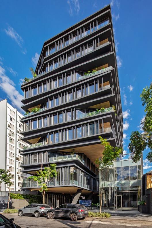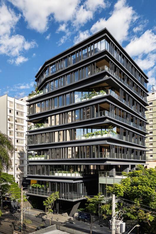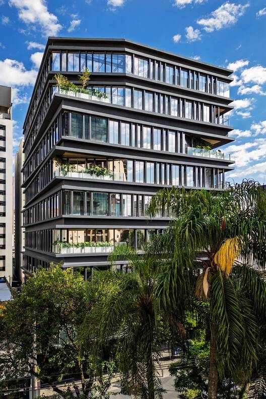 Construction Techniques and Materials Used - The building, with 8 floors, was constructed using modern building techniques that ensure flexibility and adaptability to different market segments. The use of aluminum frames and a cross-ventilation system are some of the key technical aspects that allow natural light to enter and fresh air to circulate. The materiality of the project is marked by finishes in sober and wood-like tones, chosen to reflect sophistication and sustainability. The landscaping incorporates native species, contributing to integration with nature and the project's environmental commitment.
