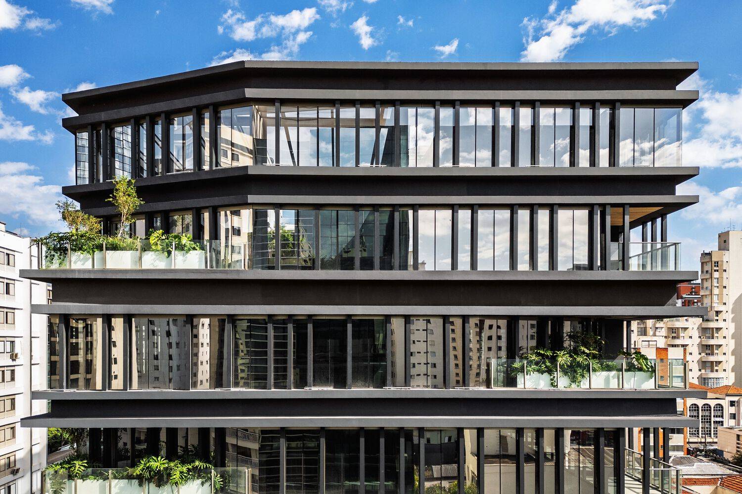 Development of the JHA Corporate Boutique: Inspirations and Concepts - The JHA Corporate Boutique, designed by PSA Arquitetura, was conceived with the goal of reimagining corporate spaces, promoting not only functionality but also the quality of life for users. The main inspiration came from the need to integrate the work environment with the urban surroundings, creating a visual and functional connection. The design prioritizes visual permeability, with floor-to-ceiling windows and interspersed balconies that provide better natural lighting and a harmonious interaction with the external environment.