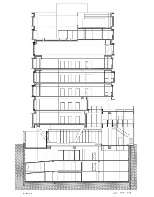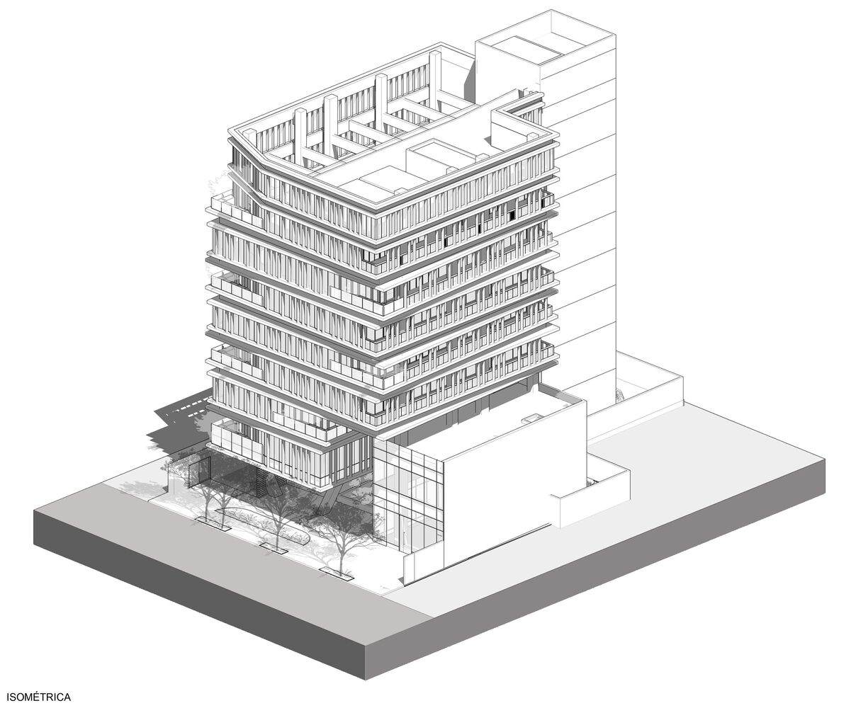 Spatial Configuration and Justification - The spatial configuration of the JHA Corporate Boutique was carefully planned to maximize functionality and productivity. The floor plates, ranging from 605 m² to 826 m², were designed to be versatile, allowing adaptation to different work arrangements. The arrangement of balconies and interspersed windows not only creates a dynamic visual effect on the facade but also enhances occupants' connection with the outdoors, promoting a healthier and more stimulating work environment. The ground floor, with "V"-shaped columns and an internal garden, offers areas for decompression and social interaction, reinforcing the proposal for a corporate space that values the quality of life and social engagement.