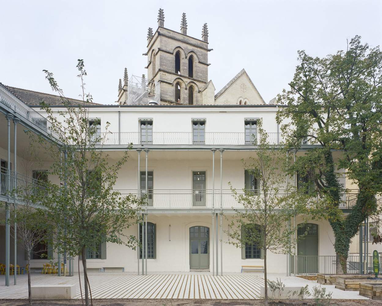 Stratification of exterior spaces -Around the 1880s, garden-side galleries were built with cast-iron columns, brick vaulting, and metal-beamed floors. These walkways provide shade and shelter, offering large outdoor extensions connected directly to the first-floor classrooms. Due to various structural, fire safety, and accessibility issues, comprehensive reinforcement work was necessary to open these areas to public use. These now-functional spaces offer shaded outdoor study areas—perfect for Montpellier's Mediterranean climate.