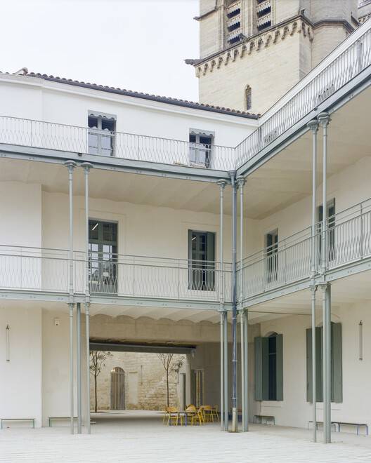 Text description provided by the architects. The building of the former annex of the Montpellier Music Conservatory, located in the heart of the Écusson district and in close proximity to the Saint-Pierre Cathedral, holds significant heritage value. Since it was acquired by the Ursulines in 1679 to establish the Saint-Charles House, the complex has undergone numerous modifications and substantial densification, particularly during the 20th century. Our intervention consisted of a complete rehabilitation of the building to accommodate the Pierre and Colette Soulages Primary School. To achieve this, we adopted a subtractive approach. Through a meticulous process of archaeological assessment and identification of remarkable elements, we developed a methodology for preserving and reinforcing key features while making bold decisions about demolitions to recover the site's essence.