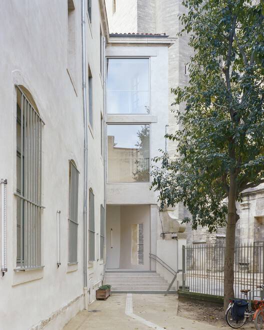 The third void, at the gable end of the West Wing, frames the gallery while directing the gaze towards the National School of Dramatic Arts of Montpellier, which was once connected to the current building. Demolitions in the 1990s erased the historical urban fabric—now only signified by these large openings. Large-scale aluminum-framed windows provide generous natural light throughout the school while offering new perspectives on Montpellier's historic city center.