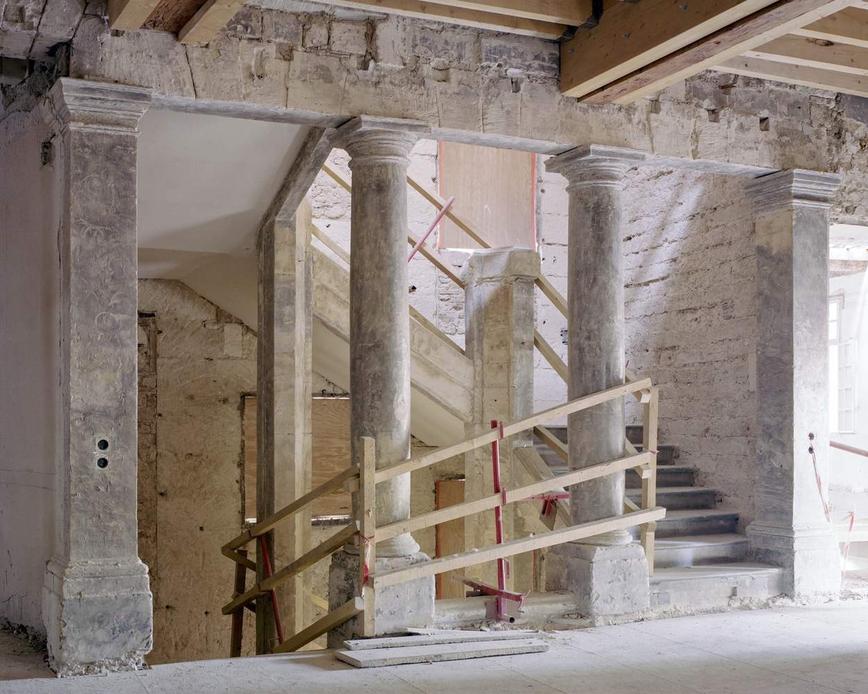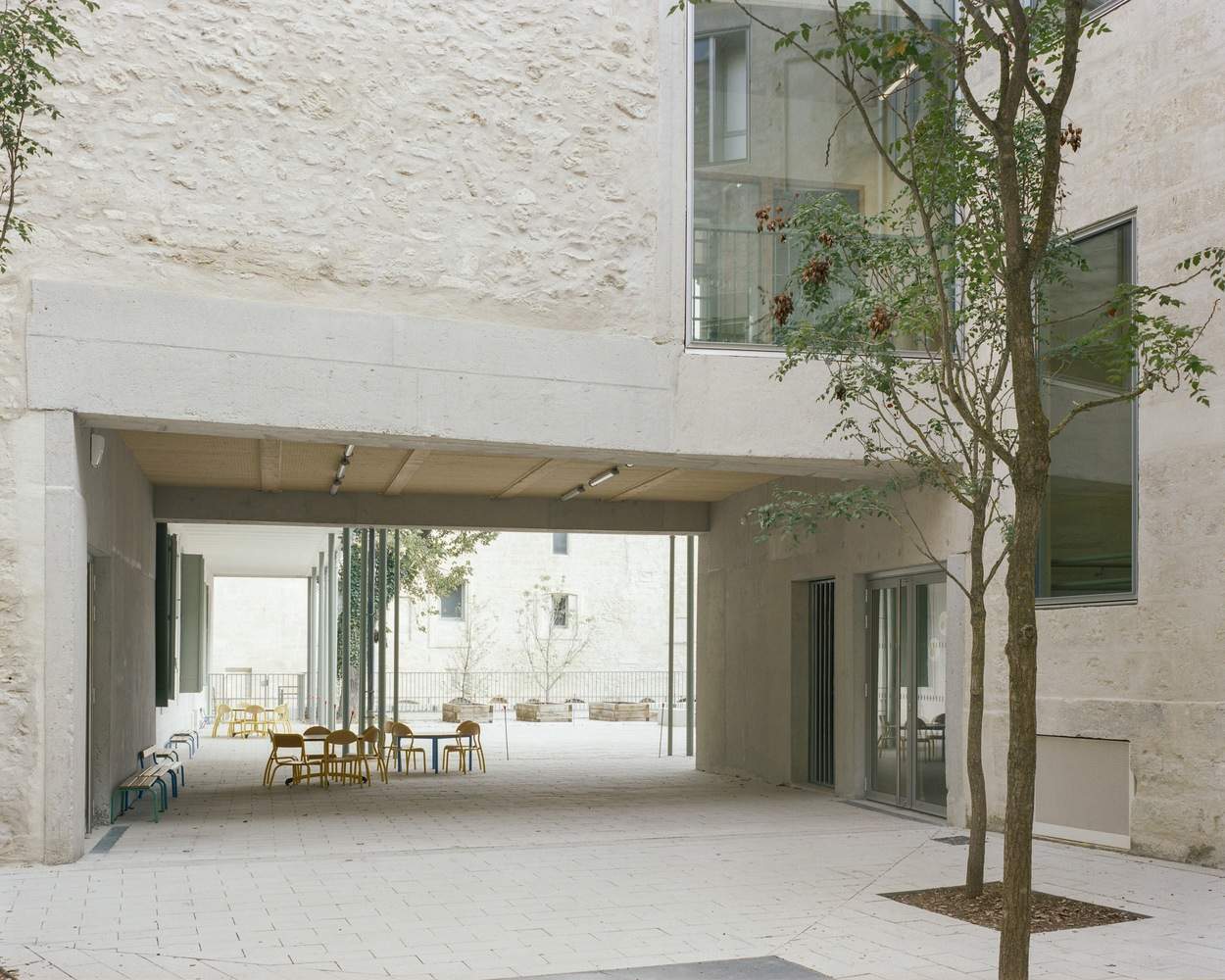A Rediscovered Porosity -The patio becomes the central space of the Primary School. Directly accessible from the entrance, it serves as a link to the playground via a monumental passage. This gesture directly references the original plan of the Ursuline Convent, which connected the Grand Courtyard—now the patio—to the gardens, transformed into today's playground.Demolition of the 20th-century constructions that obstructed this area revealed the historic facades of the Saint-Charles House and the Hôtel de Brissac. Every wall surface tells a story through its exposed stonework. The grand staircase's façade has regained its original function, with reopened historical openings that re-establish the rhythm of solid and void associated with this important access point—also offering new views of the cathedral spire.