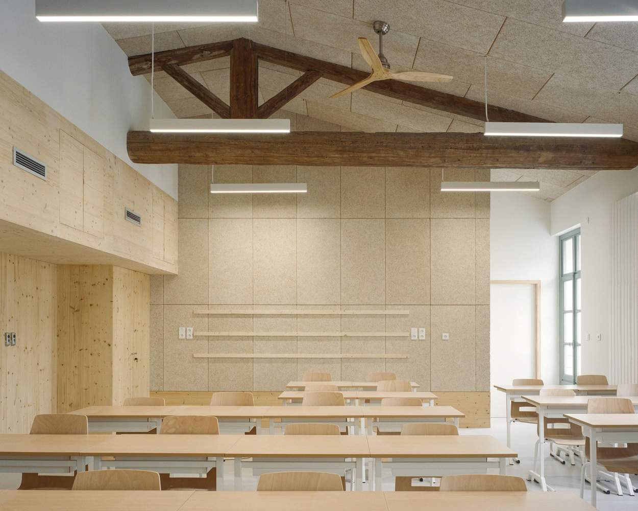 Embracing the Site's Material History with Humility -The interior spaces were treated with restraint and simplicity. Stone walls were stripped of accumulated layers, revealing finely laid masonry that reflects former architectural functions. Concrete was chosen for its ability to open learning spaces toward circulation areas. Left raw and sandblasted, it now shapes part of the spatial identity.Other interventions favored timber in all its forms: from solid or perforated wall paneling to fiber ceiling, and custom furniture installations to refine the entrances and conceal technical ducts.All floors were entirely removed, leaving only the main beams exposed. A new floor system was installed using a technique that preserved visible beams below, completed with a clay-bead screed, and finished with appropriate acoustic flooring. These choices were made to provide optimal learning conditions aligned with the expectations of a contemporary primary school.
