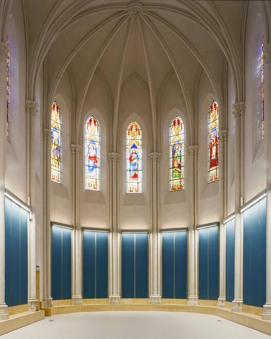 设计选择和世俗主义-小教堂是该遗址历史的有力标志。它由建筑师Nulma Polge于1857年以新哥特式风格建造,在20世纪90年代进行了重大改造,增加了一个混凝土夹层,将建筑分为两个音乐学院的表演空间。修复的主要目标是通过拆除中间地板来恢复原始体积。一旦拆除,整个空间都会用涂有石灰的无纺布均匀处理,以在不损坏装饰的情况下统一劣化的墙壁——尽管许多元素都是年代不确定的拼贴。所有彩色玻璃窗都被小心地拆除,用传统方法修复,然后重新安装。