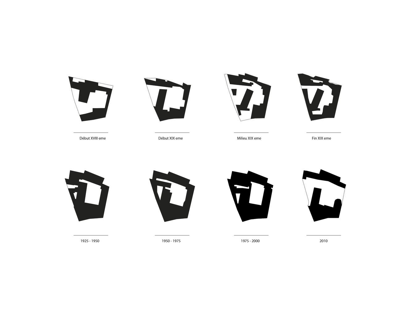 通过空隙排序-三个超大的垂直开口将建筑分割开来,揭示了关键的历史节点。第一个,从学校的新入口可以看到,标志着1792年法国大革命后乌尔苏拉修道院的出售,同时增加了“西翼”。第二个在现在的露台上可见,突出了1857年前布里萨克酒店和升高的西翼之间的联系,西翼环绕着修道院的大庭院。