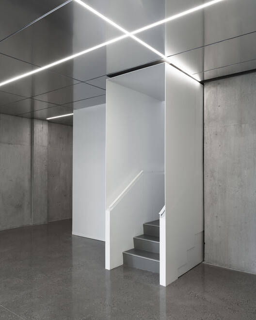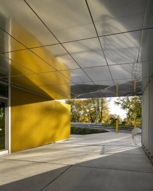 特别强调了普遍可及性。主入口的位置利用了场地的地形,确保进入展馆的通道与现有的校园人行道齐平。入口大厅在雨棚下向外延伸,形成了内外之间的平滑连接。相邻的庭院以艺术家Yann Pocreau的作品为特色,灵感来自艺术与人文学院教授的学科。