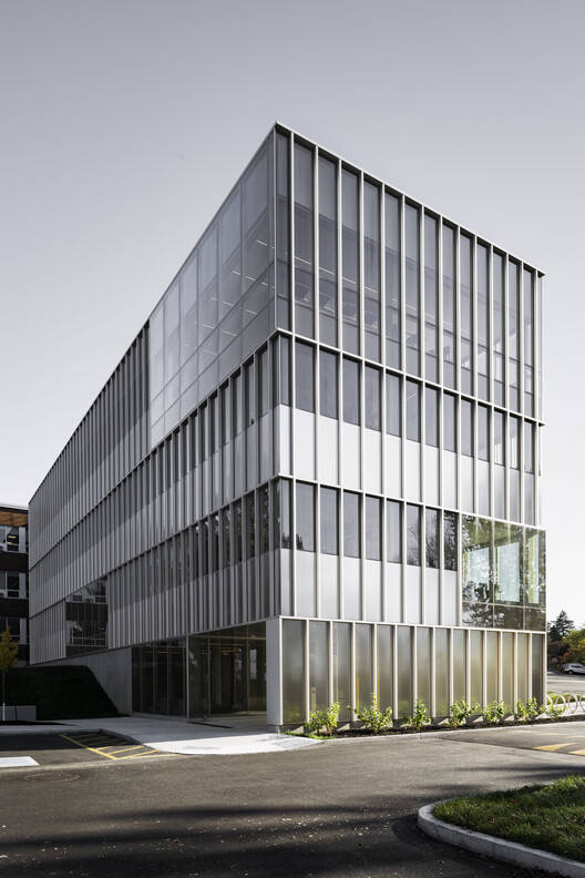 The new pavilion includes support functions for the Faculty of Arts and Humanities, such as professor/researcher offices, several meeting and conference rooms, and a large staff lounge. The offices of the professors and researchers are distributed along a regular grid, while the meeting rooms and staff lounges are distributed throughout the project following an upward movement towards the landscape. Through this ascension, the users are invited to contemplate the regional landscape from each floor and to interact and exchange ideas. These fully glazed public spaces make their presence known on the exterior as they subtly punctuate the facades.