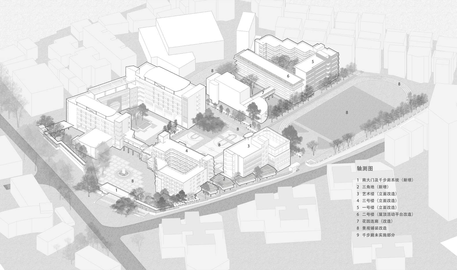 Decades of fragmented renovations had resulted in ambiguous spatial relationships between buildings and their surrounding external space. As the total construction time is restricted within 2 summer vacation periods, the core issue of renovation focuses mainly on two aspects: resolving essential functional needs and redefining a more appropriate relationship between buildings and external spaces. Meanwhile, each new gesture was conceived not as an erasure of the existence, but as a dialogue with the site's embedded texture, allowing old and new to coexist and creating a new identity of the campus.