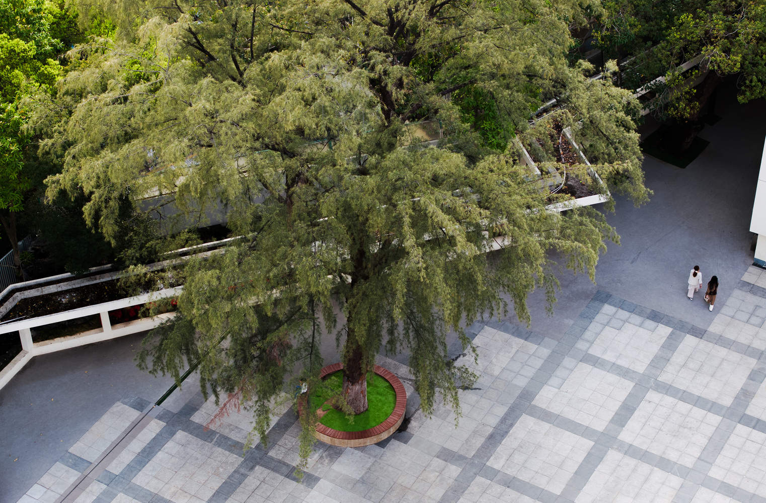 有盖的通道沿着三角形区域的自然坡度变成了几个用餐平台,形成了不同规模的庭院,创造了一个舒适的用餐环境。这些平台的角度轮廓精确地适应了场地的三角形几何形状和现有的树木,同时为高架钢雨棚结构激发了动态的伞形框架几何形状。在紧凑的三角形场地内,平台的绿色与现有的树木建立了亲密的关系,垂直纹理的铝板也与景观的微妙尺度相呼应,营造出独特的空间氛围,与街道形成了更积极的界面。