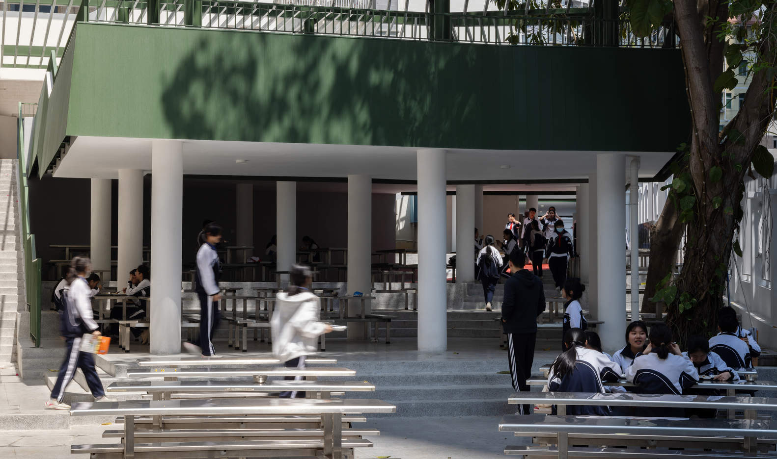 The third courtyard in Shekou school is the most public space — the sports field. It functions as an outdoor living room gathering the entire school community. Instead of a clear distinction between buildings and landscape, we conceive buildings and existing trees as a symphonic interface. The north facade of the Art Building performs as a visual anchor point of the "outdoor living room" along its long axis. After completing the building's volume, the white loggia facade formulates a formal face towards the outdoor open space and acts simultaneously as a quiet background nestled among the trees.