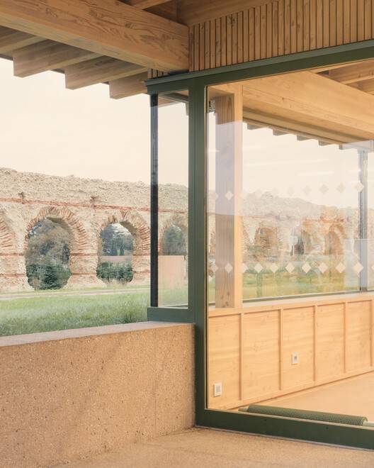 Text description provided by the architects. Nearly 2,000 years ago, Lugdunum (Lyon) was mainly located on the hill of Fourvière. In order to provide drinking water to the entire city, four aqueducts transported water from the nearby mountain ranges (Mont d'Or, Monts du Lyonnais, Pilat Massif) to the capital of Roman Gaul. The Gier aqueduct was by far the longest (over 80 km) and the most technically complex, given the geography it traversed. Its most spectacular legacy today is the alignment of 72 arches, which powerfully emerge at the Plat de l'Air site, to the north of the town of Chaponost. It is here, in direct contact with one of the last tangible remnants of the Roman memory of the area, that the Vallée du Garon Community of Municipalities chose to establish a new tourist office in 2019, at the heart of this remarkable site. The project plot, located in direct view of the aqueduct's arches, was then a slightly sloped, vacant lot, classified as agricultural land in the local urban planning map, limiting the future construction to a maximum floor area of 100 m².