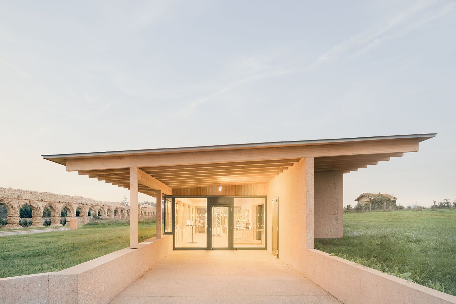 The project is imagined as a service infrastructure rather than a building, much like the aqueduct itself. The intention is not to reduce the intervention to a mere constructed object but to shelter a space that, in a sense, has neither a beginning nor an end, embracing the entire landscape that faces it. The project is set within the site, following the geometry of the aqueduct in a linear fashion. The project is divided into three layers: *The first layer, which rationally places the parking areas in direct connection with the existing roadway. A path that links the entrance to the tourist office, and a meadow that distances the building from the street, both to protect it from nuisances and to open up the view of the aqueduct. *The second layer inscribes the building, supported by a retaining wall that manages the slope of the land. *The third layer is left open, so as not to alter the entire site.