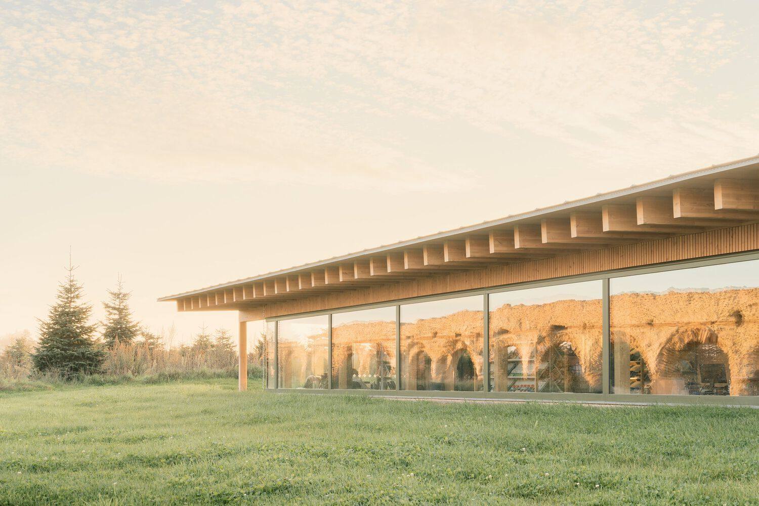 A series of Douglas fir posts supports a beam, which in turn supports all the roof purlins. This structure mirrors the rhythm of the arches, but expresses lightness. The roof is therefore reduced to its simplest expression, with a visible purlin network on the ceiling that characterizes the space, giving it a domestic identity. The project aims to be welcoming, and the raw materials are left exposed, without coatings. The zinc roof blends into the landscape, ensuring the greatest possible delicacy in a spirit of "disappearance," leaving space for the presence of the aqueduct, without any spectacular gestures. The project, not by mimicking but by interpretation, resonates with the aqueduct. Beyond the materiality of the walls, an attentive dialogue is established regarding the proportions and composition of the two structures.