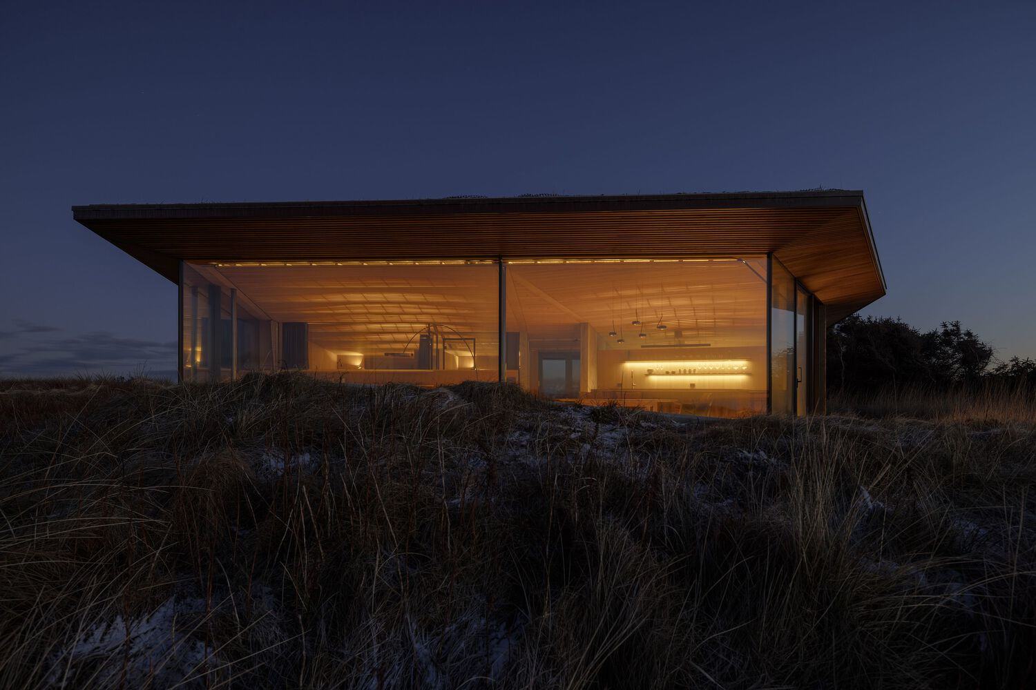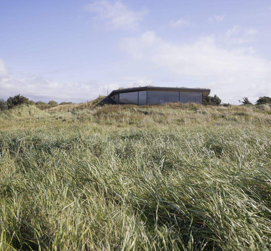 The house appears like a dune that opens towards the sea, with the rear part embedded into the landscape. The grassy landscape extends seamlessly over the roof. A three-part, continuous panoramic window offers a 180-degree view directly towards the open sea and the expansive beaches to the east and west of the property.