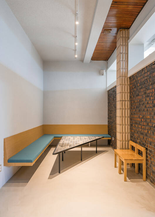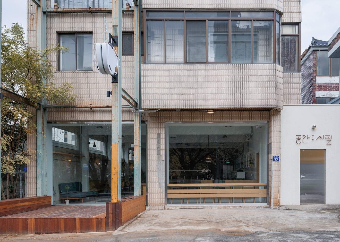 Text description provided by the architects. space timefill is a medium-sized flat cafe inside an old residential complex. There is a small cloth running right in front of the cafe. It means a space for everyone who needs time. As it is a space in an alley with time, the facade of the building is also in the form of construction. It was designed as it is. It was intended to create a space without boundaries between the outside and the inside.