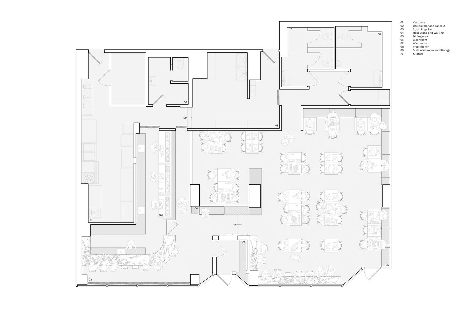 The bar flows into a sushi prep area, a chef-activated space that exhibits the day's offerings. Grounded in simplicity and restraint, the project captures our ongoing interest in dichotomy — the critical act of bringing opposing ideas into the conversation — as well as our commitment to executing contextually sensitive design and thoughtful urban renewal at any scale. In this space, each architectural gesture is intentionally streamlined to produce an honest and poignant dialogue with what already exists. Sometimes, the quieter the interventions, the more they stand out.
