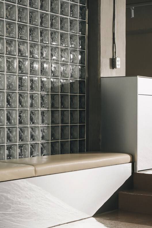 我们的设计通过挖掘机会和惊喜的材料层学科来拥抱这种原始的建筑环境。赤土色瓷砖、沙色皮革和白橡木家具的温暖色调为厚重的混凝土结构增添了柔软感。柱子和横梁的坚定方形几何形状与圆形对话,揭示了微妙的拱形门口、发光的球形吊坠和圆形的鸡尾酒吧。不透明的混凝土通过玻璃块、高光泽环氧树脂地板和不锈钢木制品与透明、半透明和反射进行对话。光线穿过波浪形玻璃,滑过反光地板,并从拉丝金属上反弹,将自发的纹理和运动时刻投射到稳固、不可移动的背景上。