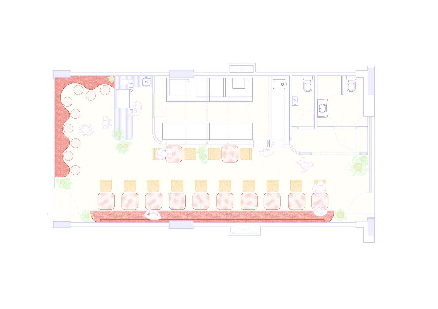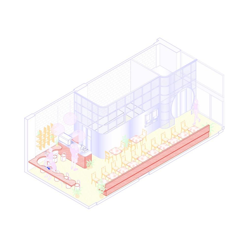 我们还在桌面上尝试了一种新的纹理,不同颜色的瓶盖组合会产生污渍。曲线构建了俯瞰外部的酒吧。在这种情况下,我们选择使用酚醛面板来建造它。这些面板也是一种可持续的选择,因为它们的碳足迹低于传统建筑材料,并且可以在使用寿命结束时回收利用。我们还使用天然染料为它们上色,类似于当地手工艺品的染色方式。使用相同的材料,我们制作的货架尊重现有混凝土砖的模块。我们还选择了一家使用酚醛树脂制造桌椅的供应商。