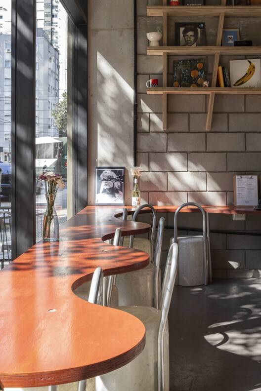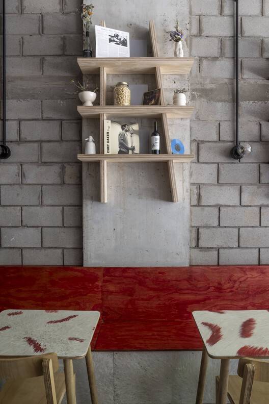 We also experimented with a new texture on the table tops, where stains are generated by the combination of different colors of bottle caps. The curve builds the bar that overlooks the exterior. In this case, we opted to use phenolic panels to construct it. These panels are also a sustainable option, as their carbon footprint is lower than that of traditional construction materials and they can be recycled at the end of their useful life. We also use natural dyes to color them, similar to how local artisanal pieces are dyed. With the same material, we make shelves that respect the modules of the existing concrete bricks. We also chose a supplier that works with phenolic to make tables and chairs.