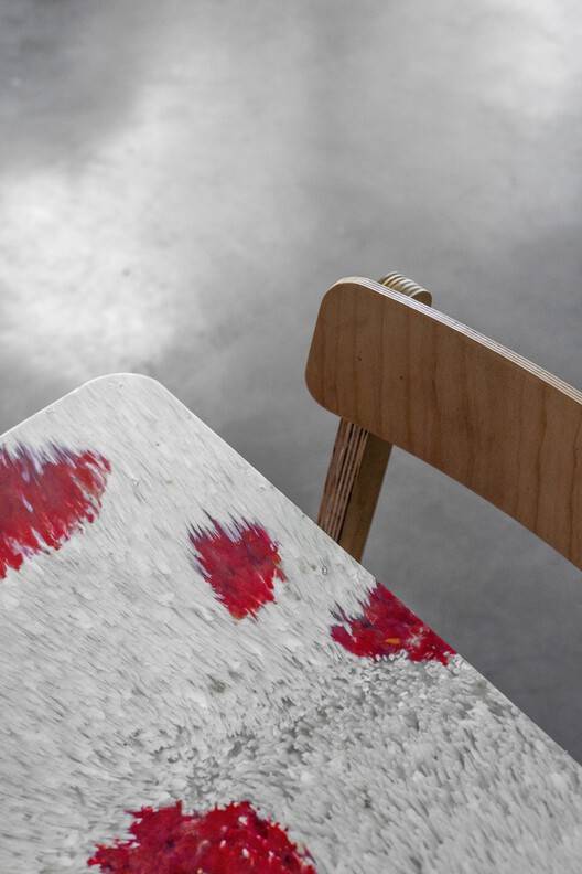 Sensory Stimulation: One of the established requirements was to keep the kitchen closed. To comply with this specification, we designed a structure that houses both the kitchen and necessary services. The completion of this construction creates a play of natural lights and reflections that interact with the textures of the environment. Instead of opting for conventional glass, we decided to use polycarbonate arranged at various angles, achieving an interesting texture that blends with the reflections of light. Reflections that materialize color. The object reflects the colors that we perceive. In a simple experiment, natural light falls on the surface of a recycled plastic table, and the red color wave bounces off it, resulting in its reflection on the metallic surface.