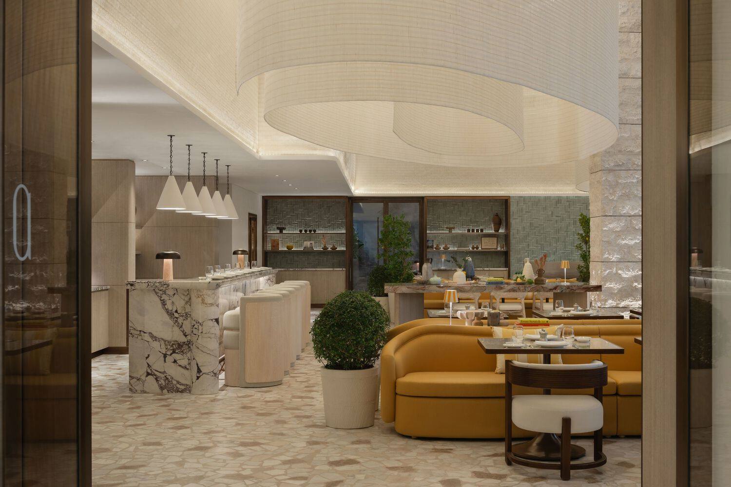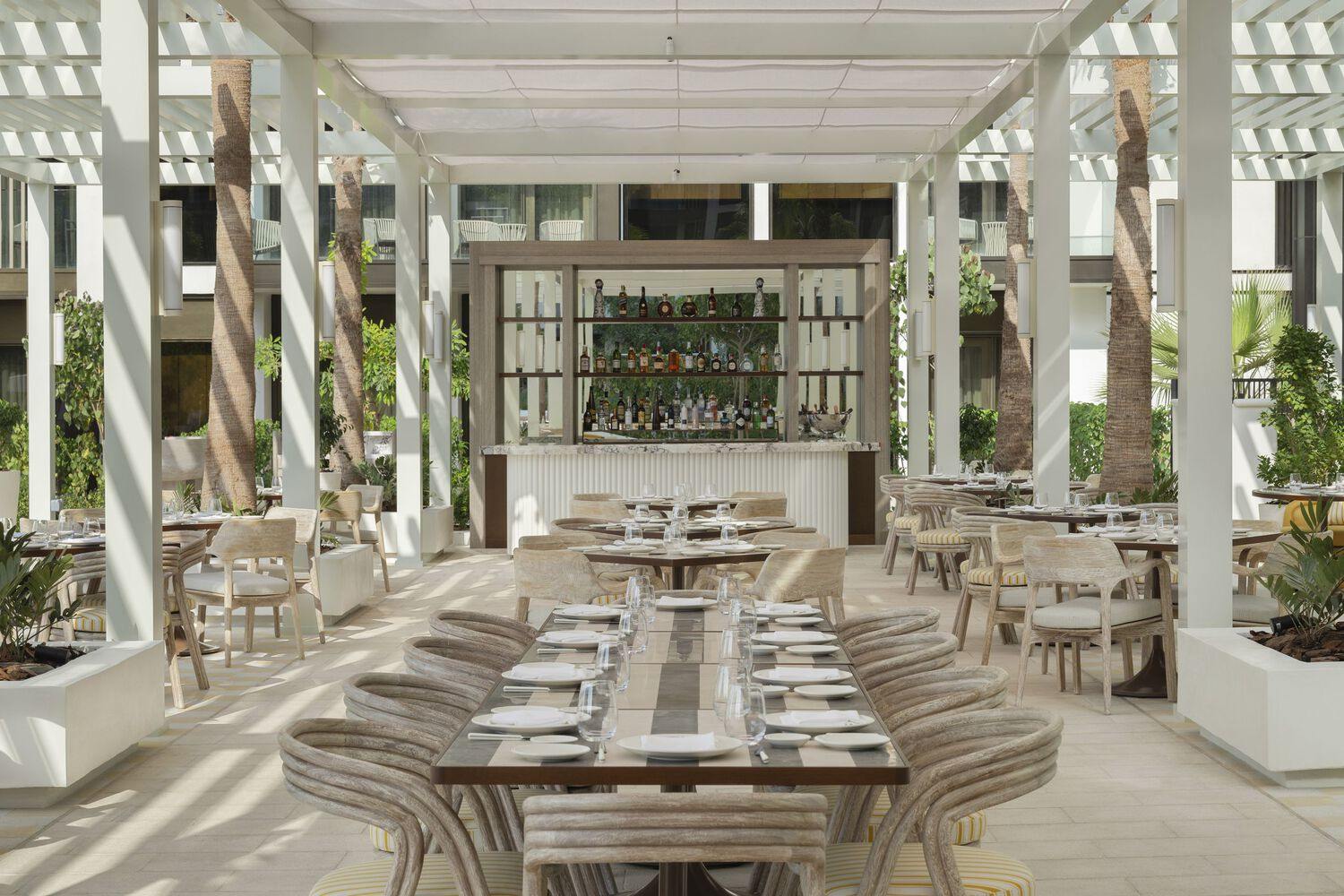 ELASTIC's design for Tutto Passa Restaurant captures the enchanting spirit of the Amalfi Coast with its expansive alfresco dining terrace, set by the pool and mindfully built around the natural beauty of the surrounding trees. A signature ceiling fabric feature, in a soft yellow hue inspired by Amalfi sunsets, gently drapes overhead, softening the space and adding warmth throughout. Traditional elements, such as a built-in oven, contribute to the authentic dining experience while a stunning wine tunnel connecting Tutto Passa and the Rose Bar, bridges day and night. The wine tunnel acts as a "secret" speakeasy-style secondary entrance to the Rose Bar or serves as an exclusive private dining room. Designed as a versatile all-day dining space, it effortlessly transitions from daytime casual elegance to a sophisticated evening ambiance, opening seamlessly onto a garden terrace that merges the indoors with the outdoors.