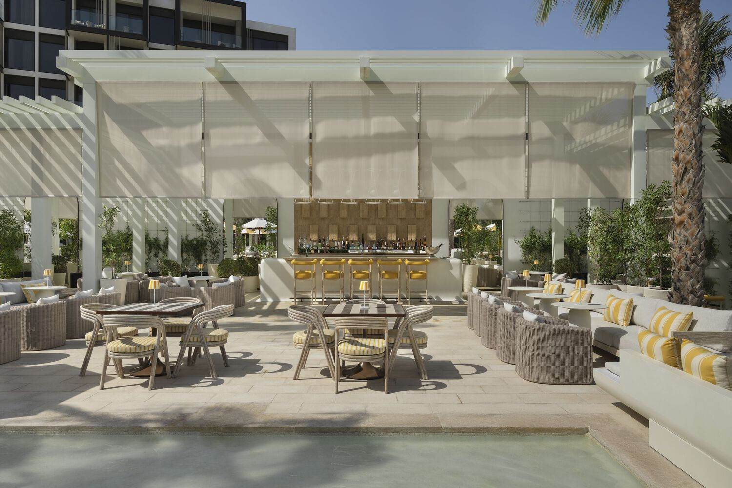 At the Delano pool, ELASTIC completely transformed an underutilized terrace into a vibrant and distinctive destination, imbuing it with character and purpose. Custom-designed, luxurious outdoor furniture crafted from natural materials and textures complements a palette of fresh, crisp neutrals enriched with timeless brand-inspired patterns. To enhance the guest experience, we mindfully curated diverse seating arrangements that cater to various needs, from casual lounging to elevated dining in a relaxed yet sophisticated setting. Each seating vignette is strategically anchored around the central pool, offering guests stunning views and dynamic vantage points from every angle. Recognizing the brand's commitment to exclusivity, we incorporated a range of seating options, including private cabanas designed to cater to VIP clientele. Playful design elements and thoughtfully created zones further enliven the space, ensuring an engaging atmosphere that feels both inviting and memorable.