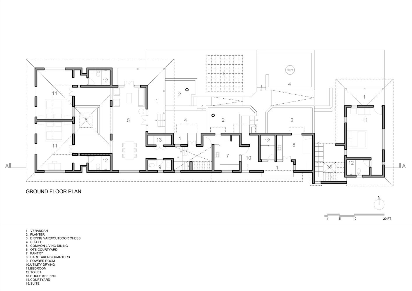 The main house is a courtyard home with two bedrooms and the living and dining spaces arranged around the courtyard. A skylit, windowless staircase block separates the main house from the service block which contains the pantry, store, and caretaker's quarters. This block has independent external access. The staircase leads to two rooms, one a suite on top of the living-dining and the other to a bedroom with a mezzanine space, which is located above the kitchen-staff room. The last two bedrooms are arranged as an outhouse with two floors, separated from the main block by an external courtyard.