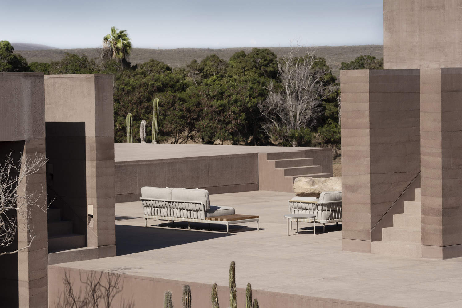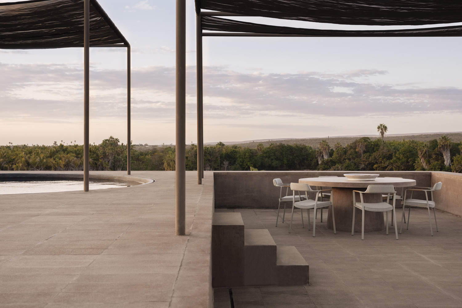 A circular rooftop pool has been conceived as a celestial oasis where guests can enjoy expansive ocean and sky views while the covered terrace is the social center of gravity for the home, creating an inviting year-round, day-to- night gathering place.Using natural materials from the site, Vipp Todos Santos' rammed earth construction is ideally suited for its climate, sustainably-built, naturally cooling by and insulating at night. Sturdy walls, crafted from compressed earth, and left in their raw state line the exterior and interior of the building. Its expansive windows frame panoramic ocean views, further connecting the interior with its natural surroundings.
