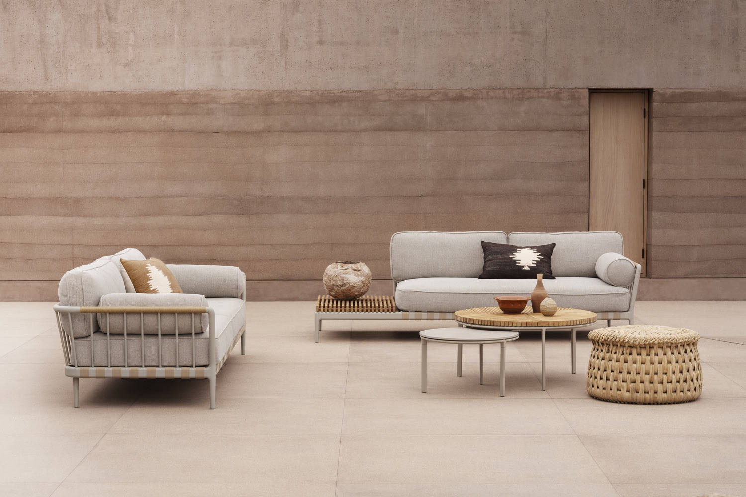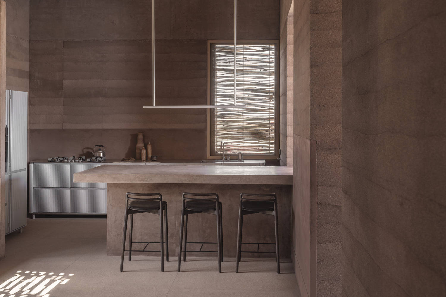 Featuring an interplay of natural tones and textures, its serene spaces were created to evoke a sense of tranquility, integrating custom furniture and design details that honor local craft and weaving techniques as well as art, textiles and ceramic pieces sourced from the area. Each element in the home has been selected to complement the minimal material palette of earth, concrete and wood. Window shutters woven frombranches of the local Palo de Arco tree add a handcrafted element to the building and cast ever changing shadows in the space throughout the day.