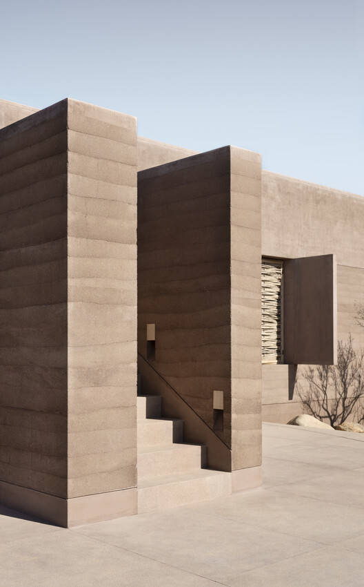 场地与环境的完美融合:该项目最令人印象深刻的特质在于其与当地环境的无缝融合。建筑师巧妙地运用夯土这一天然材料,不仅呼应了当地的沙漠地貌,更实现了可持续的建造方式。通过体量和阶梯式外部楼梯的精心布局,建筑与地形完美契合,创造出一种动态的相互作用。圆形屋顶游泳池的设置,进一步强化了与环境的对话,为宾客提供了欣赏壮丽海景的绝佳场所。这种对场地特性的尊重和利用,是该项目在设计理念上的核心亮点,展现了对地域文化的深刻理解。