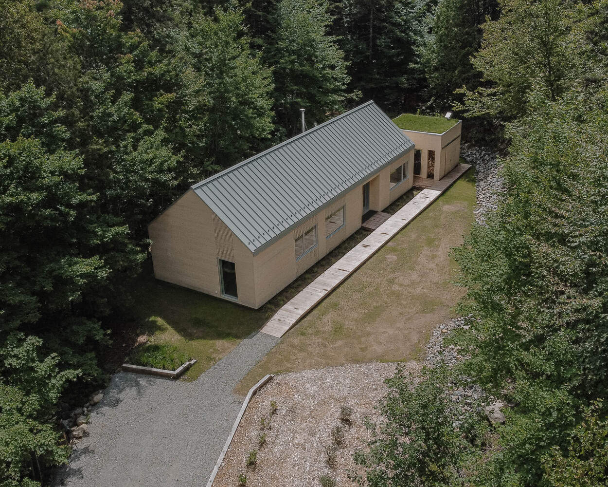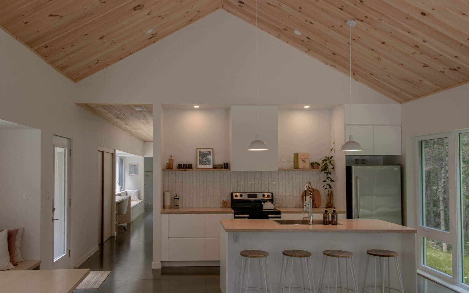 Design: Simplicity and Elegance in Harmony with the Landscape - Joshua MacDonald's design philosophy, shaped by his education at McGill University and the University of Waterloo, is fully realized in Chalet Le Thuya. Specializing in sustainable construction and the creation of welcoming spaces, the architectural designer skillfully incorporated design elements that strengthen the connection between the indoors and outdoors. Large windows flood the rooms with natural light while offering breathtaking views of the forest and river, creating a constant connection with the enchanting surroundings of the chalet. The materials used, selected for their durability and natural aesthetic, align with an eco-friendly approach, reflecting a commitment to preserving the local environment. The simplicity of the design is evident throughout the space, from the open kitchen—the true heart of the home—to the bathroom, which offers calming views of the forest.