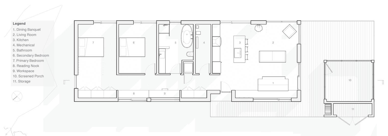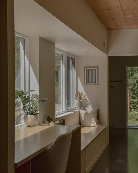 设计理念与空间布局:项目的精髓在于其简洁而优雅的设计语言。建筑师摒弃了过度的装饰,强调空间的功能性和与自然的联系。开放式厨房和浴室等核心空间的设计都充分考虑了采光和景观视野,增强了室内与室外的互动。麦克唐纳的设计理念受到他在麦吉尔大学和滑铁卢大学教育背景的影响,专注于可持续建筑和创造温馨空间。所用材料的选择也体现了环保理念,与周围环境相协调。小屋的空间布局旨在为住客提供一个放松身心的场所,无论是炉火旁的小憩,还是在自然背景下阅读,都体现了对生活品质的追求。