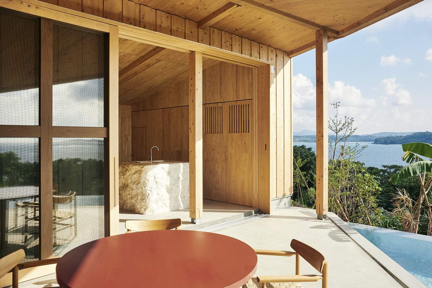 在这里,客人可以在早晨的阳光下在餐桌上吃早餐,当天气太热时,可以在游泳池里泡一泡来降温。当它再次冷却时,他们可以悠闲地享受时间,看书或在餐桌上喝一杯。晚上,他们可以欣赏到大海上美丽的日落,然后在天气变冷时洗澡。他们可以在厨房做饭,在餐厅享用晚餐。当他们开始感到困倦时,他们可以去后面的卧室好好休息一晚。倒V形的空间让客人在室内和室外之间度过无缝而悠闲的时光。