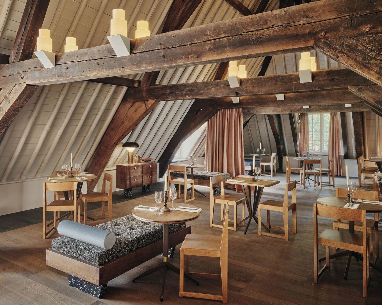 A few steps further up lies 'Salone Royale,' a spacious attic area for large groups, furnished with a combination of comfortable poufs, chairs, daybeds, and tables. The tall wooden ceiling, gable roof and exposed beams create an expansive yet intimate ambiance that celebrates its vernacular architecture. Sculptural lights on the beams add a modern touch, while a diverse mix of seating and tables adds a further dash of character. A cocktail bar features elements similar to those on the ground floor, with suspended travertine spherical light fixtures on the front bar. The sloping walls of the back bar are entirely covered in mirrors, offering guests a closer view of the bartenders at work.The versatility and playfulness of this floor encapsulate the essence of Hotel Rumour: a historic building given new life by a design aesthetic at once playful, refined and grandiose with a galaxy of details that reveals more of itself on every visit.